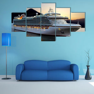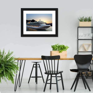 This serene canvas art captures a majestic cruise ship silhouetted against a beautiful sunrise backdrop. With a palette of calming blues and warm oranges, it brings a peaceful ambiance to any space.