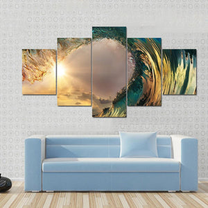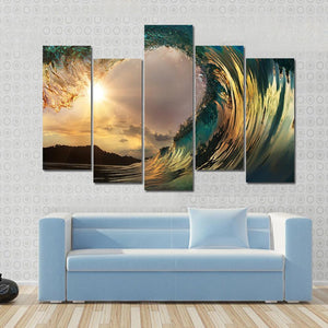 This artwork captures a majestic ocean wave at sunset, showcasing sunlight streaming through the wave and sparkling water droplets. The photorealistic style and dynamic palette of blues, golds, and oranges create a serene yet awe-inspiring atmosphere.