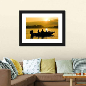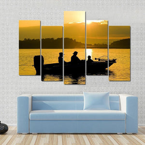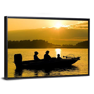 This canvas features the serene silhouettes of fishermen on a boat at sunset, surrounded by calm waters and distant trees. The warm oranges and golds create a peaceful atmosphere, making it a lovely addition to your wall decor.