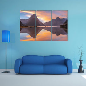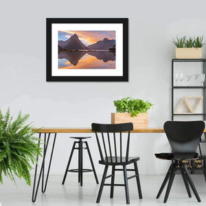 Glacier At Milford Sound shows jagged mountain peaks mirrored in a still lake at sunset, with streaky clouds above. The symmetrical composition and a palette of blues, oranges, pinks, purples, and gray create a serene yet dramatic atmosphere. It suits modern, nature-inspired interiors as a peaceful landscape focal point.