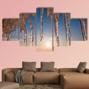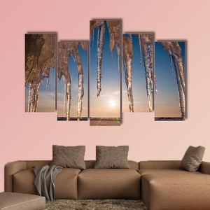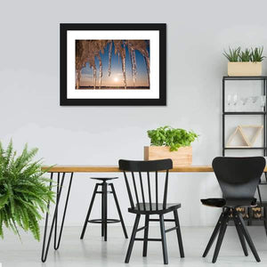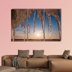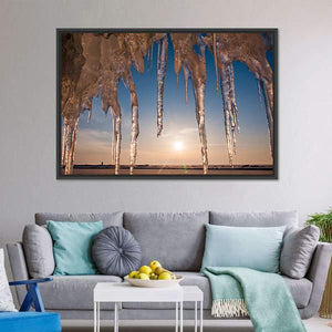 Ice With Icicle Sky shows icicles hanging in the foreground as the sun sets over the ocean, with a person standing on the shore. Shot with a dutch-angle, telephoto feel, the nature photography mixes blue, orange, white and yellow tones for a serene, cold atmosphere. Suits modern homes and room decor such as living rooms or entryways.