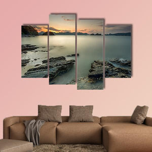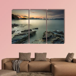 A nature photograph of Langkawi Beach in Malaysia capturing a rocky shoreline, smooth water and distant islands beneath a soft sunset sky. The long-exposure image creates a serene, tranquil atmosphere with blues, grays and warm orange tones. A calm focal piece suited to modern living rooms or bedrooms.