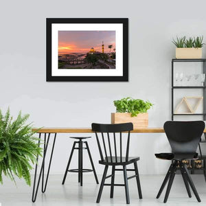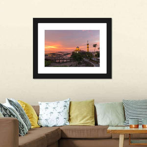 Mosque Al-Hussain Canvas Wall Art shows a photorealistic mosque and tall minaret at sunset along a calm coastline. Warm orange, pink and blue tones give a serene, golden-hour atmosphere — suited to home wall decor, living rooms, entryways, or quiet prayer spaces.