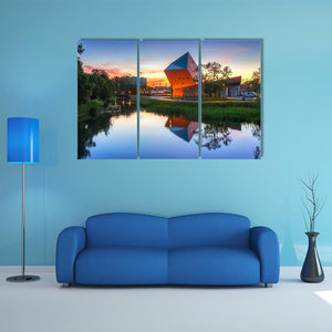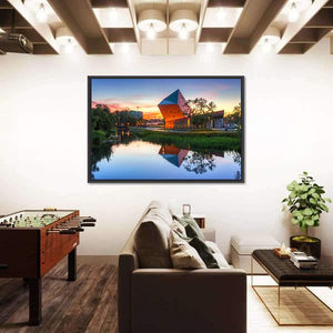 This canvas depicts a modern museum building beside a river at sunset, with trees on the bank and the structure’s geometric design mirrored in the water. Soft blues, warm oranges and pinks, plus touches of green and yellow, create a serene, reflective mood that suits modern rooms and living spaces.