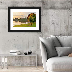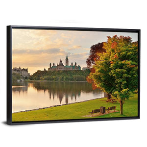 Ottawa Skyline At Sunrise on canvas captures the city’s stone towers and riverside reflections in a realistic autumn scene. Trees with fall colors and park benches line the water, set against a green, blue and grey palette that feels calm and scenic. The peaceful, serene mood fits living rooms or modern offices as nature-focused wall decor.