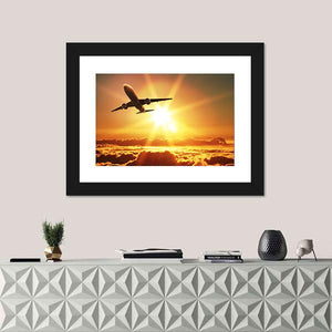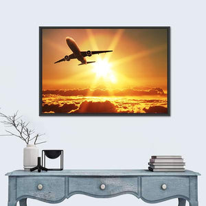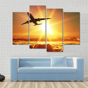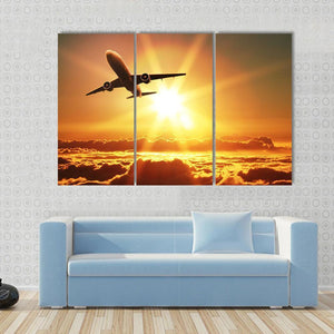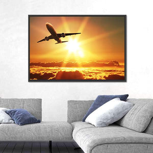 This vibrant canvas artwork captures an airplane soaring above clouds at sunrise. With its warm palette of orange and yellow, it evokes feelings of adventure and awe. Ideal for modern spaces that celebrate nature and travel.