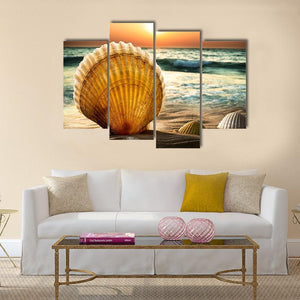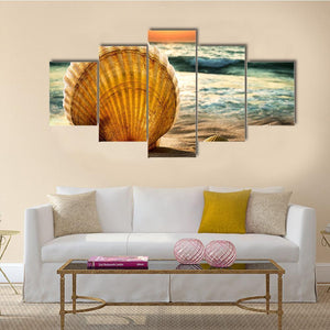 Sea Shells In The Sand features a large scallop shell in the foreground with two smaller shells nearby on a sunlit beach, rippling waves, and a setting sun. Photorealistic, vibrant colors in golden, blue, orange, and tan create a warm, tranquil glow. This canvas suits a beach house or modern living room as relaxed, nature-focused wall decor.