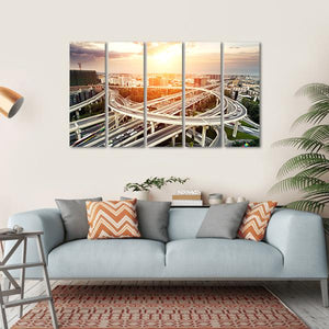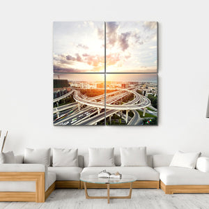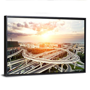 This canvas wall art captures the dynamic intersection of a city skyline and highway system. With a photorealistic style, it conveys a sense of vast complexity, showcasing traffic on the roads against a backdrop of vibrant sunset colors—blues, grays, and oranges. Ideal for modern urban spaces.