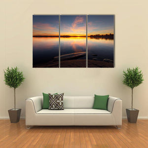 This canvas wall art captures the tranquil beauty of a serene sea, reflecting the soft hues of a sunrise over the water. With a modern landscape style, it showcases the stunning palette of orange, blue, and purple, perfect for adding a peaceful atmosphere to your space.