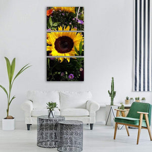 A close-up, realistic canvas of a sunflower with green leaves and delicate purple flowers, showing the dark center and warm yellow tones. The image reads vibrant and cheerful, with a natural springtime feel that suits modern and nature-inspired rooms.