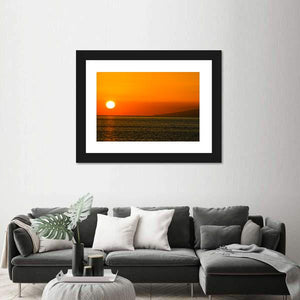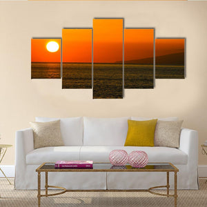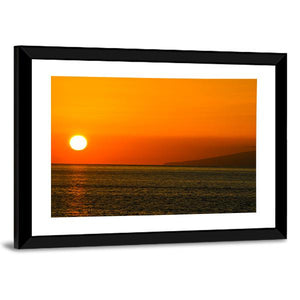 A photorealistic canvas print of the Atlantic Ocean at sunset, with the sun low on the horizon and its reflection on the water. Warm orange and yellow meet blue and dark green along the coastline, creating a serene, peaceful mood. Suits modern or coastal interiors and makes a calm focal point for your room decor.