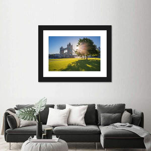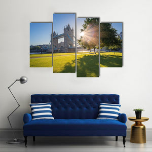 This canvas art features the iconic Tower Bridge at sunrise, capturing the serene beauty of London. The photorealistic design showcases vibrant blues and greens, creating an optimistic atmosphere for your space.