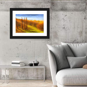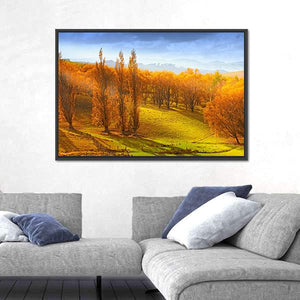 This canvas wall art captures the serene beauty of autumn in New Zealand, featuring tall trees adorned with vibrant orange foliage and rolling hills bathed in warm sunlight. The peaceful atmosphere is perfect for bringing a touch of nature indoors.