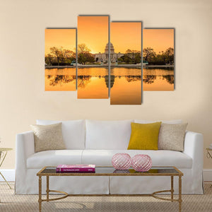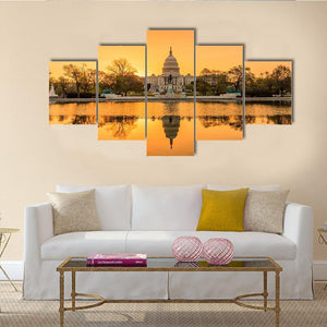 Sunrise Over Capitol Building Canvas Art depicts the US Capitol Building at sunrise, its dome and flanking trees mirrored in the foreground water. Warm orange and yellow tones in a realistic landscape create a peaceful, serene, and slightly majestic mood that suits modern home decor and living rooms or entryways.