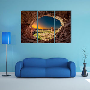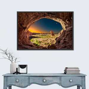 This canvas wall art captures a serene desert landscape viewed through a majestic natural arch. The warm palette of oranges and browns contrasts beautifully with shades of blue, creating a wild yet tranquil atmosphere. Ideal for nature lovers and rustic decor enthusiasts.
