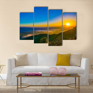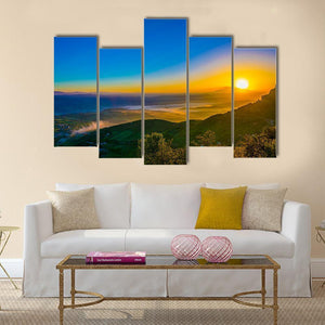 A modern landscape showing a sunrise over a fog-filled valley near Enna in central Sicily, with the sun just above the horizon and rolling green hills. Soft blues, warm oranges and yellows create a serene, peaceful, optimistic morning scene that suits modern home interiors.