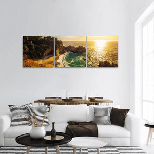 Sunset over the Pacific Coast Highway in California captures a wide panoramic view of coastline, ocean, cliffs and a sunlit beach. Realistic, vibrant colors in golden, blue, green and warm brown create a serene, majestic mood with sun flare on the water and waves crashing, suited to coastal or modern nature-inspired rooms.