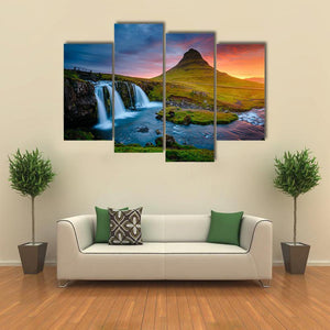 Kirkjufell Mountain with Waterfall at Sunset Canvas Wall Art