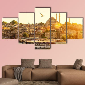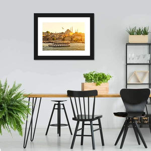 Istanbul at Sunset captures a tranquil coastal cityscape with a ferry boat with multiple decks passing before mosque minarets bathed in a setting-sun glow. The photorealistic image uses golden, blue, white, and brown tones to create a scenic, historic mood that suits modern living rooms or offices.