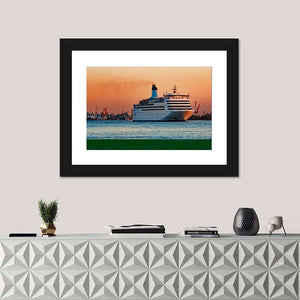 White Passenger Ship Canvas Wall Art depicts a white passenger cruise ship at a port, with water and sky rendered in blue, orange, white, and grey tones. The realistic image uses a rule-of-thirds composition and captures a calm, serene sunset scene with smoke rising from the ship's chimney. It suits modern home decor and room settings.
