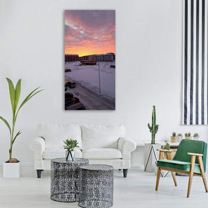 A peaceful winter scene in Bucharest, Romania shows a snow-covered field beside buildings and parked cars under a warm, colorful sunset sky. Soft orange, pink, and purple clouds create a tranquil, modern mood that suits living rooms or contemporary office spaces.