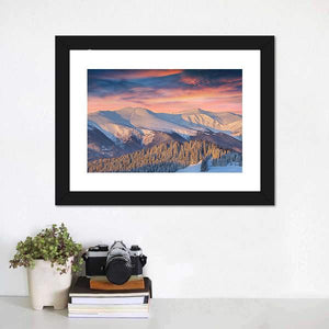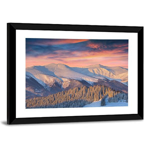This canvas features a serene winter landscape with snowy mountains, a dense pine forest, and a vibrant sunrise sky. The majestic scene is captured in a realistic style, bringing a calming atmosphere to your space.