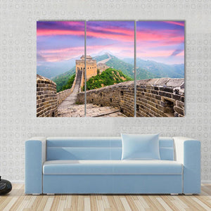 This canvas artwork captures the majestic Great Wall of China viewed from a stone walkway, surrounded by lush mountains and a dramatic sky. With its realistic style and an epic mood, it adds a captivating touch to your space.