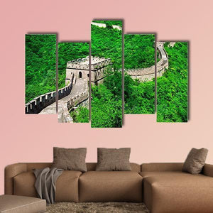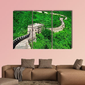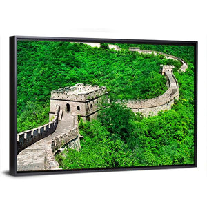 This canvas print shows an aerial view of the Great Wall of China, with a stone watchtower and battlements winding through green mountains. The diagonal lines and elevated perspective create an epic, historical mood. It works well as wall decor in a modern living room or study.