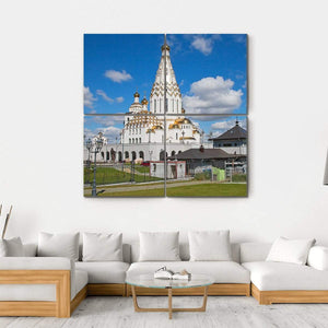 Capture the serene beauty of All Saints Church in Minsk with this canvas wall art. Featuring a stunning white church adorned with golden domes under a bright blue sky, this piece adds a touch of tranquility to any space.