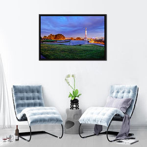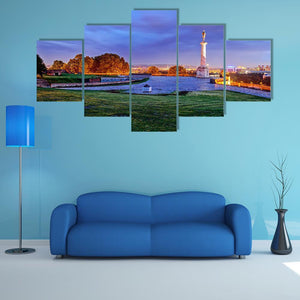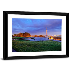 This landscape artwork features the majestic Belgrade Fortress, showcasing a statue atop a tall column with a serene river in the foreground. The serene twilight atmosphere is enhanced by a beautiful blend of blue, green, and orange tones, making it a stunning addition to any wall decor.