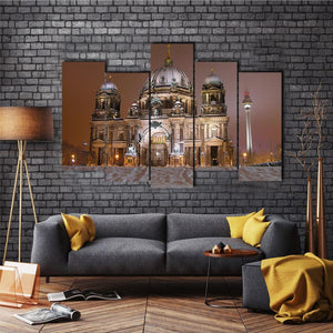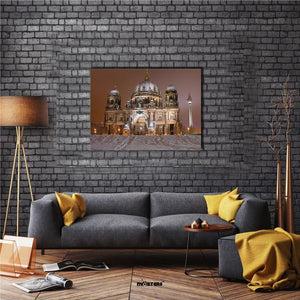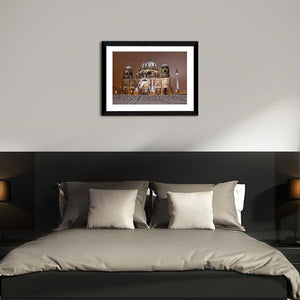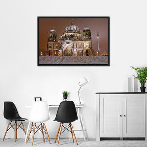 Capture the serene beauty of Berlin Cathedral in winter with this striking canvas wall art. The peaceful scene showcases an illuminated cathedral surrounded by snow, evoking a majestic atmosphere perfect for enhancing your home decor.