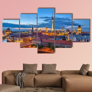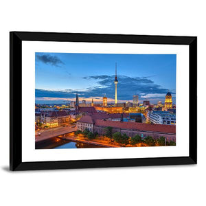 A photorealistic view of the Berlin city skyline at dusk, showing the river, bridge and the television tower. Cool blues balanced with orange and brown city lights create an urban evening mood that works well in modern living rooms or offices.