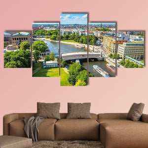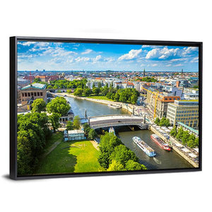 Berlin Potsdam Canvas Wall Art presents a photorealistic daytime cityscape with a river, a bridge, two boats, and a distant skyline. Its blue-green palette and sunny, lively mood work well in modern homes and as room decor.