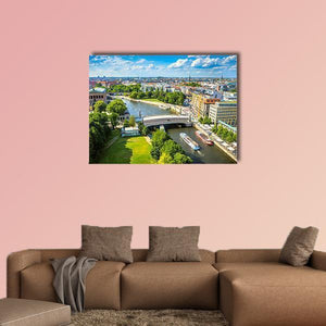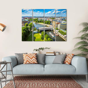 Capture the vibrant cityscape of Berlin with this stunning artwork featuring lively bridges, a serene river, and lush greenery. The photorealistic style brings depth and brightness to any room, making it a perfect addition to your urban decor.