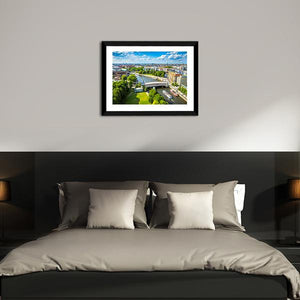 A panoramic cityscape canvas capturing a vibrant, sunny scene with a river, arch bridge and boats. The high-angle, wide view shows varied buildings and riverside trees in green, blue, yellow and brown tones, creating a bustling daytime atmosphere. Fits well in modern living rooms and office walls.