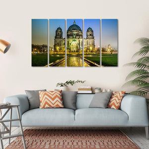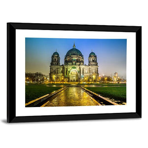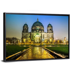 Experience the grandeur of the Berliner Dom at night with this captivating canvas art. The illuminated cathedral showcases a stunning palette of blue and golden hues, while the slick wet pavement and symmetrical architecture add a historic charm.