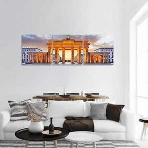 A panoramic canvas of the Brandenburg Gate in Berlin at dusk, rendered in golden and blue sunset tones that highlight its columns, arches, and the statue above. The wide, symmetrical composition carries a majestic, historical, and serene mood and suits modern interiors and city-inspired spaces.