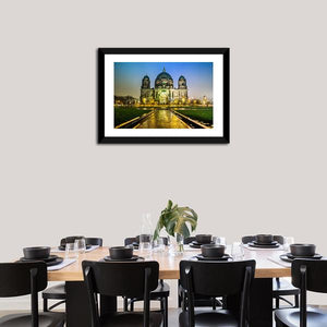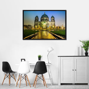 A photographic view of the Berliner Dom at night, showing the illuminated domes and their reflections on wet pavement. Symmetrical composition and strong leading lines focus on the cathedral’s central dome, with a blue, green, gold, and grey palette that gives a majestic, serene evening mood. Suits a living room or entryway as a calm architectural focal piece.