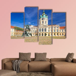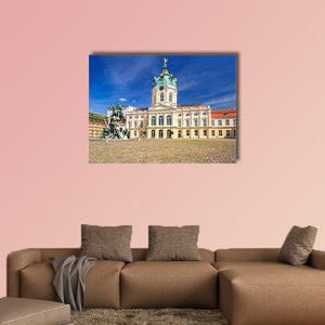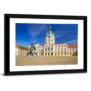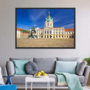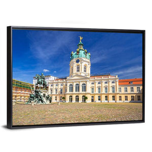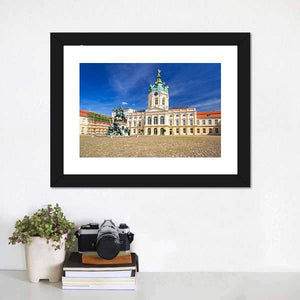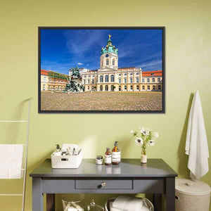 Charlottenburg Palace in Berlin is captured in a realistic wide-angle landscape, showing the ornate dome, an equestrian statue and a cobblestone courtyard beneath a clear, sunny sky. Bathed in blues, whites and warm yellows, this print brings a grand, historic mood and suits both classic and modern home décor.