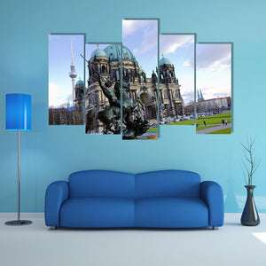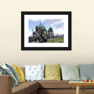 Capture the grand essence of Berlin with this stunning depiction of the Berlin Cathedral, featuring an equestrian statue in the foreground and the iconic Fernsehturm in the background. The photograph’s rich palette of blues, greens, and browns evokes a historic and imposing atmosphere, making it a remarkable addition to your wall decor.