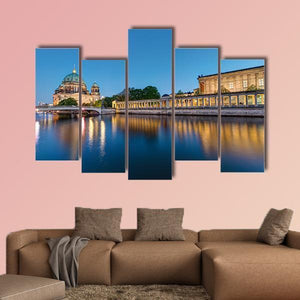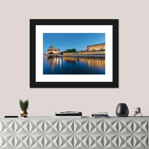 Museum Island At Dusk presents a wide-angle cityscape of a domed building, river, bridge and arcades rendered in blues, greens and golds. The realistic scene—featuring a green dome and soft river reflections at dusk—feels tranquil and majestic and works well as modern wall decor.