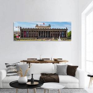 This panoramic canvas depicts people in front of the Altes Museum in Berlin, captured wide-angle at eye level. The realistic architectural scene—blue sky, beige and grey stone with touches of red and green—feels sunny, historic and lively; flags hang from the building, a crane appears at left, and an active fountain plays on the right, making it a good fit for modern or architectural interiors.