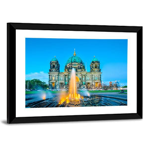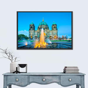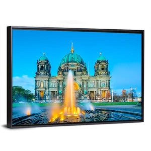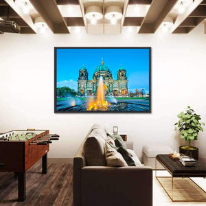 A wide panoramic canvas showing Berlin Cathedral beside a fountain under a clear blue sky. The realistic cityscape highlights dome architecture and the fountain’s water jet, with a grand, majestic palette of blue, green, gold, grey and white—suitable for modern or city‑inspired rooms.