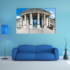 This canvas wall art features the iconic Reichstag building in Berlin, showcasing its grand architecture and historic presence. The low-angle perspective highlights the impressive columns and striking glass entrance, creating an imposing atmosphere.