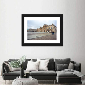 This canvas depicts Humboldt University in Berlin: an ornate historic building opening onto a cobblestone courtyard with two people walking away from the camera. Rendered photorealistically in a calm, overcast palette of beige, gray, blue, and white, the composition uses eye-level perspective and leading lines from the cobblestone path. It fits well on a study, hallway, or office wall.