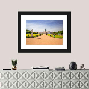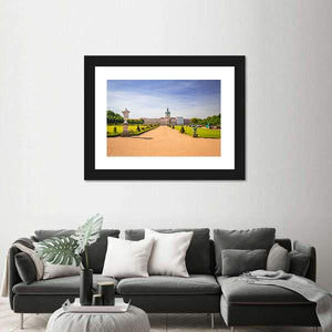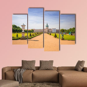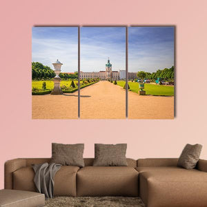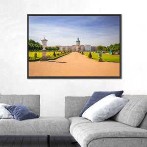 Photorealistic view of Charlottenburg’s palace gardens, with a symmetrical pathway lined by ornate urns leading to the domed tower. Greens, tan paths, blue sky and white highlights create a grand, serene, sunny scene that suits modern or nature-focused interiors.