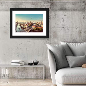 This canvas wall art beautifully captures the Berlin skyline, featuring the iconic Fernsehturm tower alongside the serene Spree River. The bright palette of blue, green, and orange evokes an expansive urban atmosphere, making it an ideal addition to contemporary decor.