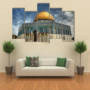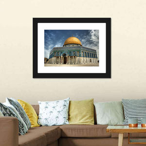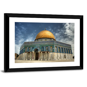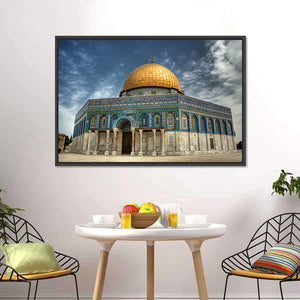 This canvas art features the majestic Al Aqsa Mosque, showcasing its stunning golden dome and intricate blue and green tiled facade. The serene scene elements evoke a sense of historic significance, making it a beautiful addition to any space.