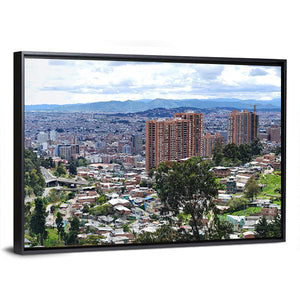 This panoramic canvas captures Bogota’s city skyline with clustered tall buildings, dense green foliage and hazy mountains on the horizon. The photorealistic scene reads as urban and vast, rendered in blue‑green‑grey tones that work well in modern living rooms or office walls.