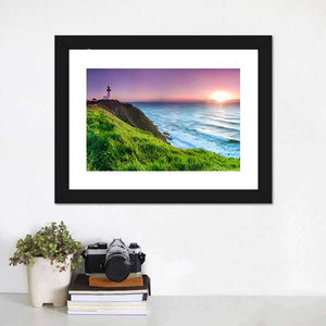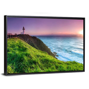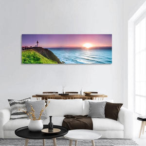 Byron Bay Lighthouse Panoramic Canvas Wall Art showcases a tall white lighthouse on a grassy cliff with gentle waves rolling toward shore beneath a vibrant sunset sky. Its realistic panoramic scene, painted in purple, pink, blue, green and white tones, creates a serene, majestic mood that fits coastal or modern living spaces.
